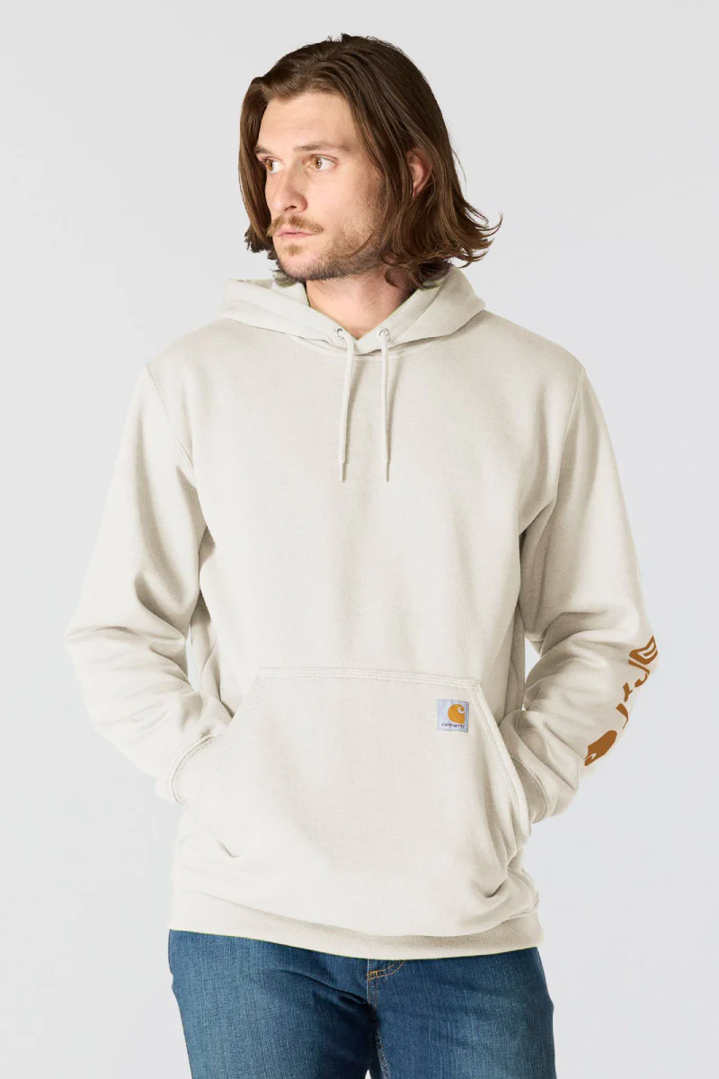 Cut the chill with Carhartt's Signature Sleeve Logo Hoodie in Malt. A midweight men's hoodie with the iconic Carhartt logo on the sleeve.